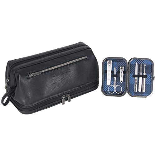 Details: Convenient hinged, zippered construction with wide mouth opening for easy access to main compartment soft, faux leather exterior with casual, yet eye-catching contrast color zips tear-resistant, easy-to-clean, fully lined interior with blue color pop accent front exterior zipper pocket to safely stores your smaller items spacious main compartment interior Includes a zipper pocket with ample room to store toiletries drop bottom, zippered compartment Consists of two elastic open top mesh pockets, an additional elastic open top pocket, with multiple loops to store a tooth brush, comb, or other needed accessories easy-to-grab side handle matching, leather-like, hinged, metal frame 6-piece grooming/ manicure set with side clasp is included grooming set components include Stainless Steel toenail clippers, scissors, fingernail clippers, nail file, tweezers, and cuticle pusher size: 10.0" L x 5.5" H x 4.5" D Weight: 0.4 lbs. includes a 10 year limited manufactures warranty
