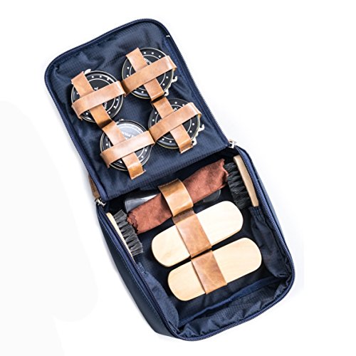 Details: This travel shoe shine kit is constructed of ballistic nylon with brown accents and includes two polishes, shine sponge, shoe horn, polishing rag, and four brushes. This is a necessity for the traveling businessman or those who wish to make a good impression wherever they go.Set includes: Two (2) polishes, one (1) sponge, one (1) shoe horn, one (1) rag, four (4) brushesDimensions: 7 inches long x 6.5 inches wide x 2 inches thickCare instructions: Wipe with Clean ClothWeight: 1.3 poundsThe digital images we display have the most accurate color possible. However, due to differences in computer monitors, we cannot be responsible for variations in color between the actual product and your screen. Type: OtherMaterial: Ballistic NylonPattern: SolidExact Color: BlueColor: Blue