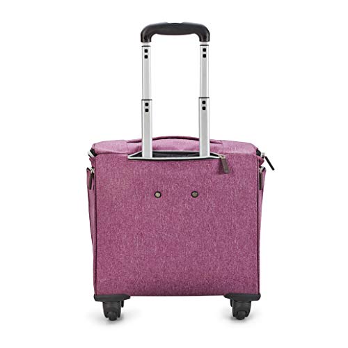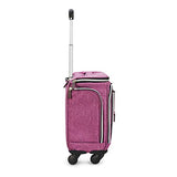 - 4-wheeled spinner carry-on with retractable aluminum trolley handle. Four exterior zippered pockets, including 2 zippered side pockets with easy access to travel items including water bottles