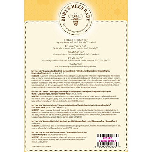 Details: Burt's Bees Baby Getting Started Gift Set, makes a welcome baby gift for a new mom. It has everything a mama needs to gently care for her little one's delicate skin. This 5 piece gift set comes in an attractive box making it the perfect gift for Mother's Day or a baby shower. It includes trial sizes of Burt's Bees Baby Nourishing Lotion, Shampoo & Wash, Cream-to-Powder, Nourishing Baby Oil and Buttermilk Soap. These baby care products are specially formulated with natural ingredients and are gentle enough to use everyday. They are pediatrician-tested and contain no phthalates, parabens, petrolatum or SLS. The convenient sizes make it easy to keep at hands reach or stash in a diaper bag. This set makes the perfect baby shower gift or a gift for a new mom. Keep baby natural with Burt's Bees Baby products from Burt's Bees.
