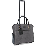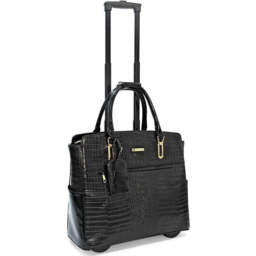 This airplane carry-on size executive rollerbrief, a croco faux leather beauty with front zipped pocket pvc detailing, is fitted for the working, traveling woman who appreciates the smart and unconventional, and features a retractable handle, two roller-blade wheels, padded compartments for a 15" laptop and an electronic tablet/reader, two top zip compartments and much more.