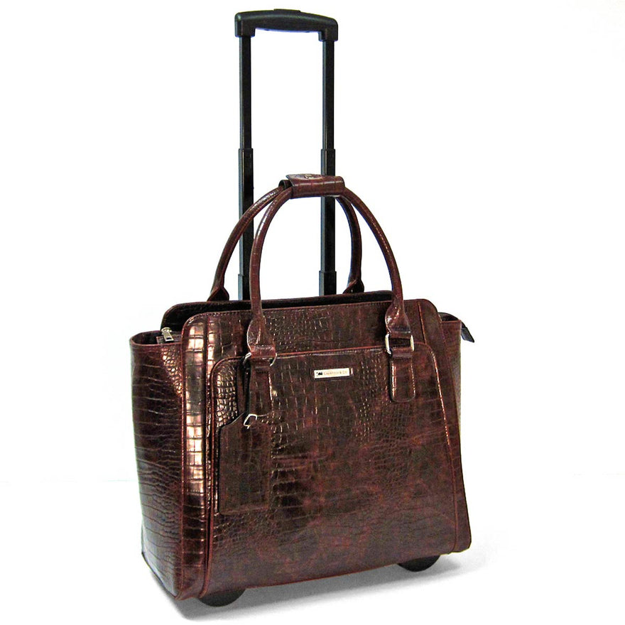 This airplane carry-on size executive rollerbrief, a faux pebble leather beauty with contrasting trim detailing, is fitted for the working, traveling woman who appreciates the smart and unconventional, and features a retractable handle, two roller-blade wheels, removable padded compartments for a 15" laptop and an electronic tablet/reader, two top zip compartments and much more.
