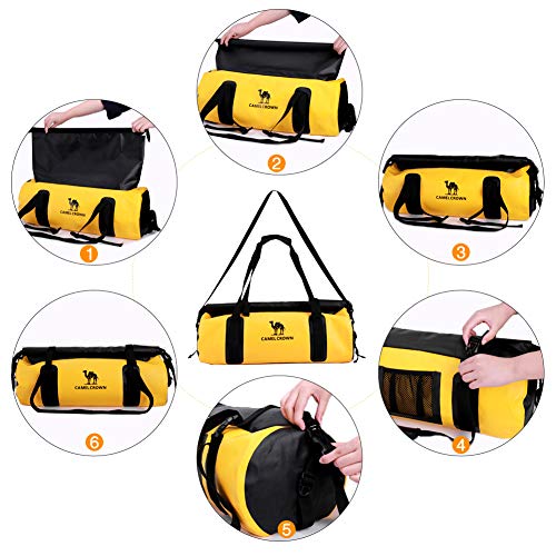 - WATERPROOF PVC FABRIC: CAMEL CROWN gym bag is made of waterproof PVC material. And a thick waterproof coating has been added to the fabric, which reserves the softness of the cover, and also ensures the strict waterproof performance, making it suitable for outdoor sports and travel.