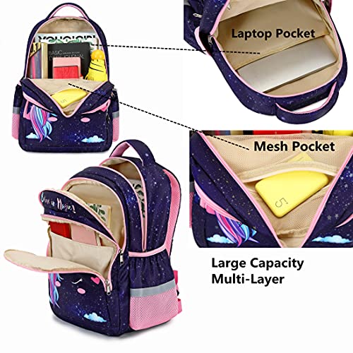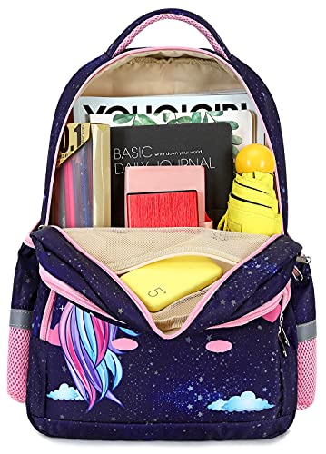 - Unicorn Backpack: Features accessory zip pocket & 2 large main compartment that can easily fit binders, folders, jackets and more. Front zippered accessory pocket is perfect for crayons, pencils, erasers, pens, glue sticks and other small items. This school bag also comes with two mesh side pockets, padded adjustable straps, with chest buckle & top padded handle.