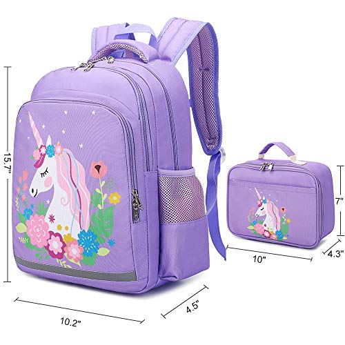 - The girls backpack set with lovely unicorn printing, including girl backpack: 15"(L)x11.8"(H)*5.1"(W) , lunch bag: 10"(L)*7.1(H)*4.3"(W) , beautiful kids backpack and lunch bag sets for your little one back to preschool, kindergarten, elementary school and casual day trips.