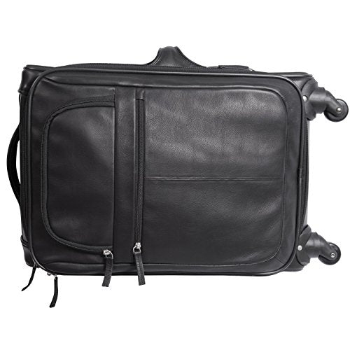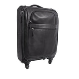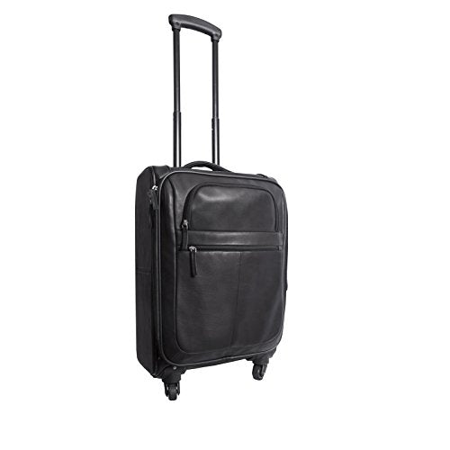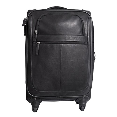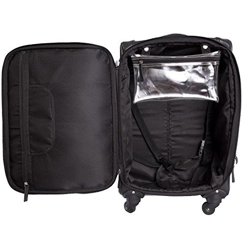 - Legal carry-on size with telescoping handle and 360 spinner wheels, two front zippered pockets, large interior zippered pocket & snap-out wet pouch