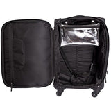 Details: Classic, traditional carry-on. This legal sized carry-on is perfect for that quick get away. Quickly work your way through the airport with the 360 degree spinner wheels and telescoping handle. It features one large main compartment with a two way zipper for easy in and out. It includes a snap out zippered bag for toiletries, an expandable zippered front and an interior clothes holder with a quick release buckle. The polydrill lining protects against spills and tears. It comes with a matching luggage tag. The t424 travel kit is a great companion.