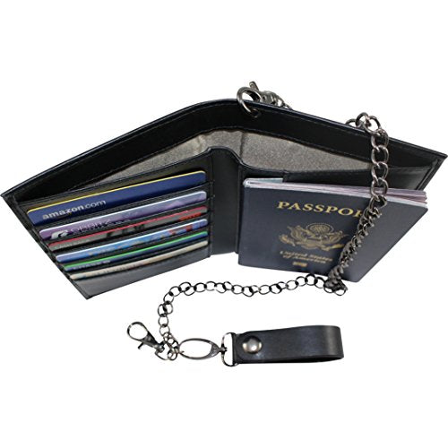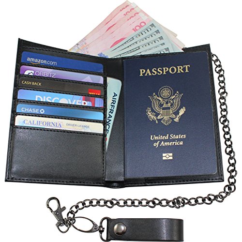 - FUNCTIONAL & FLEXIBLE - It has a large currency compartment, 6 credit card slots, 3 large slip pockets, which can hold multiple passports. The belt loop chain can be taken off conveniently yet very secure if attached.