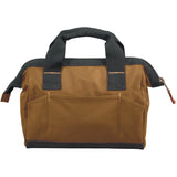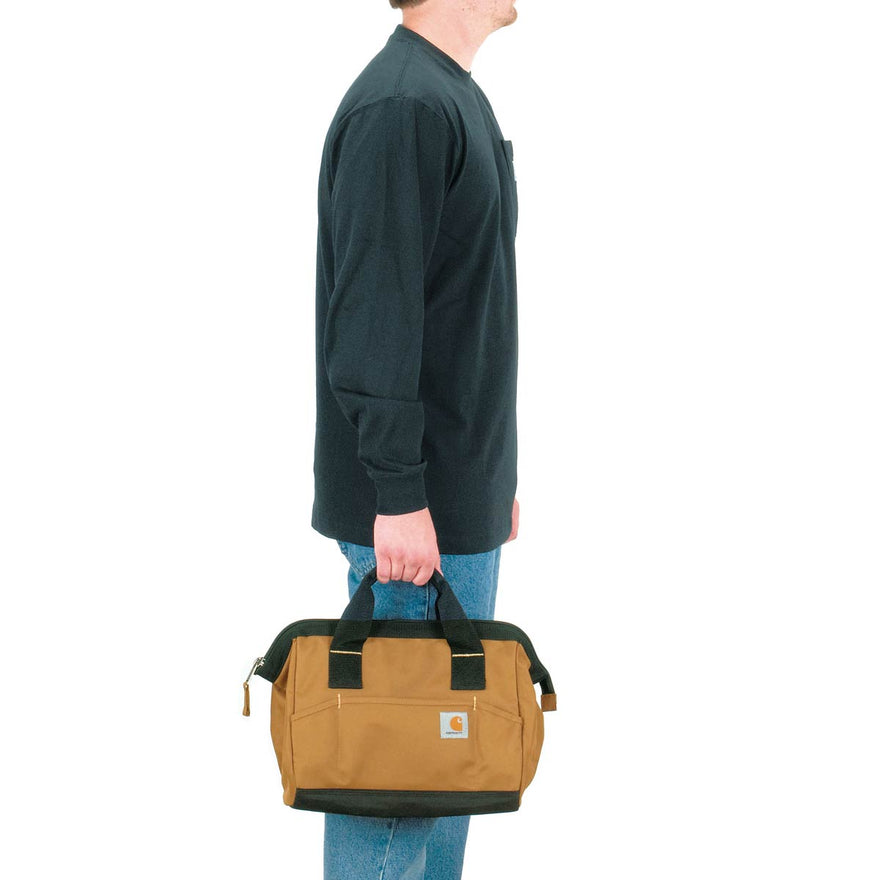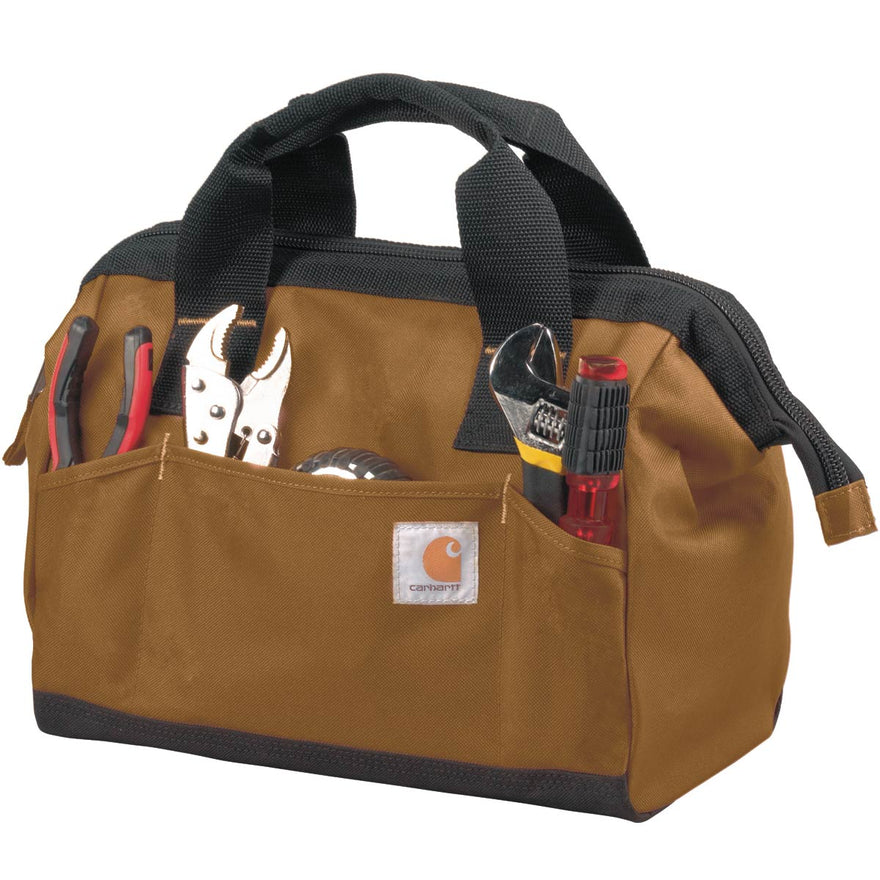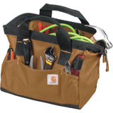 Carhartt Trade Series Tool Bags are built of sturdy Poly with Rain Defender durable water repellent to keep tools clean, dry and accessible. Tools stay organized and easy to find with a variety of different sized pockets and loops, and an internal metal frame that provides structure to easily get in and out without the bag collapsing on itself. Carhartt Trade Series Tool Bags feature YKK zippers, metal hardware, rugged comfort-grip haul handles, triple needle stitching, and the Carhartt logo patch.