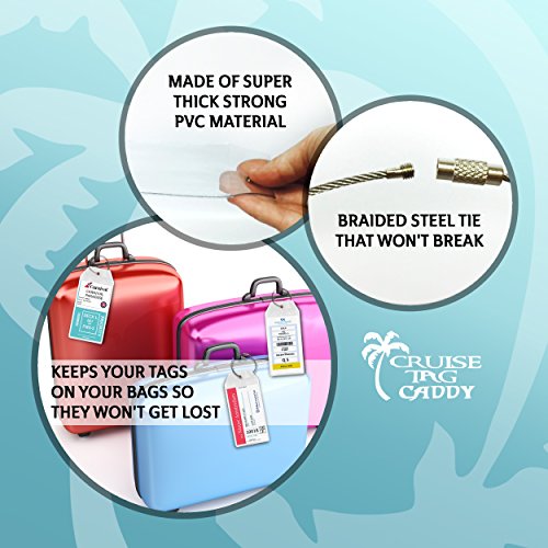 - HIGH QUALITY STEEL TIES: All cruise tag holders have a braided stainless steel loop that easily secures your tags to your bags by tightening the threaded metal barrel connector. These ties will not break!