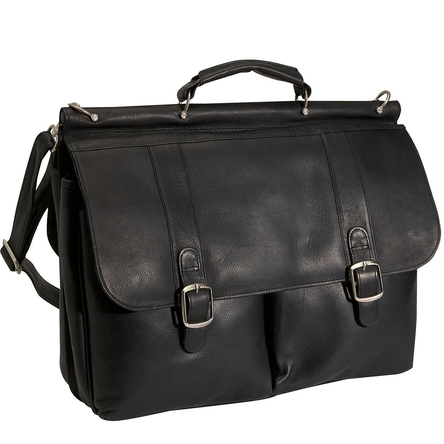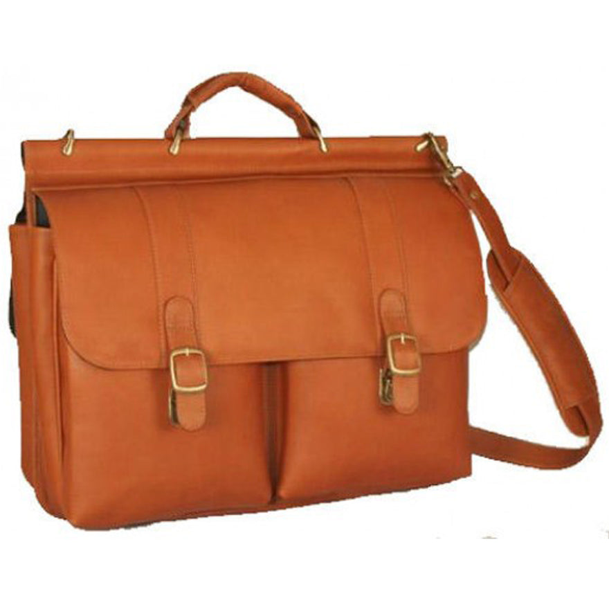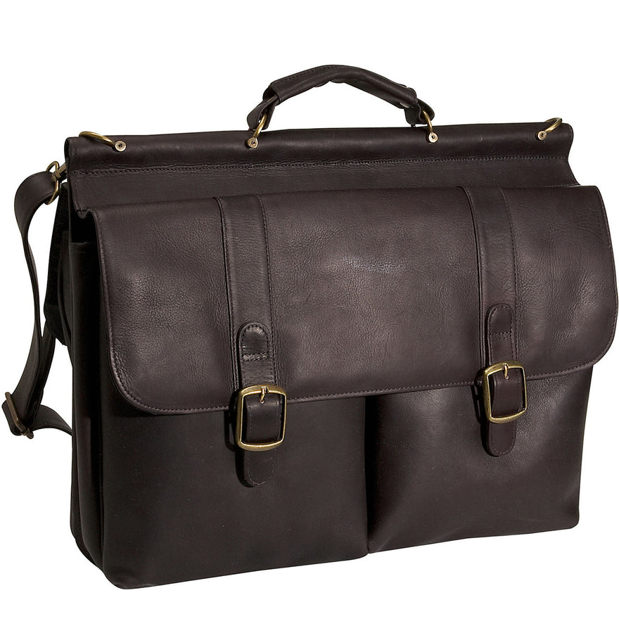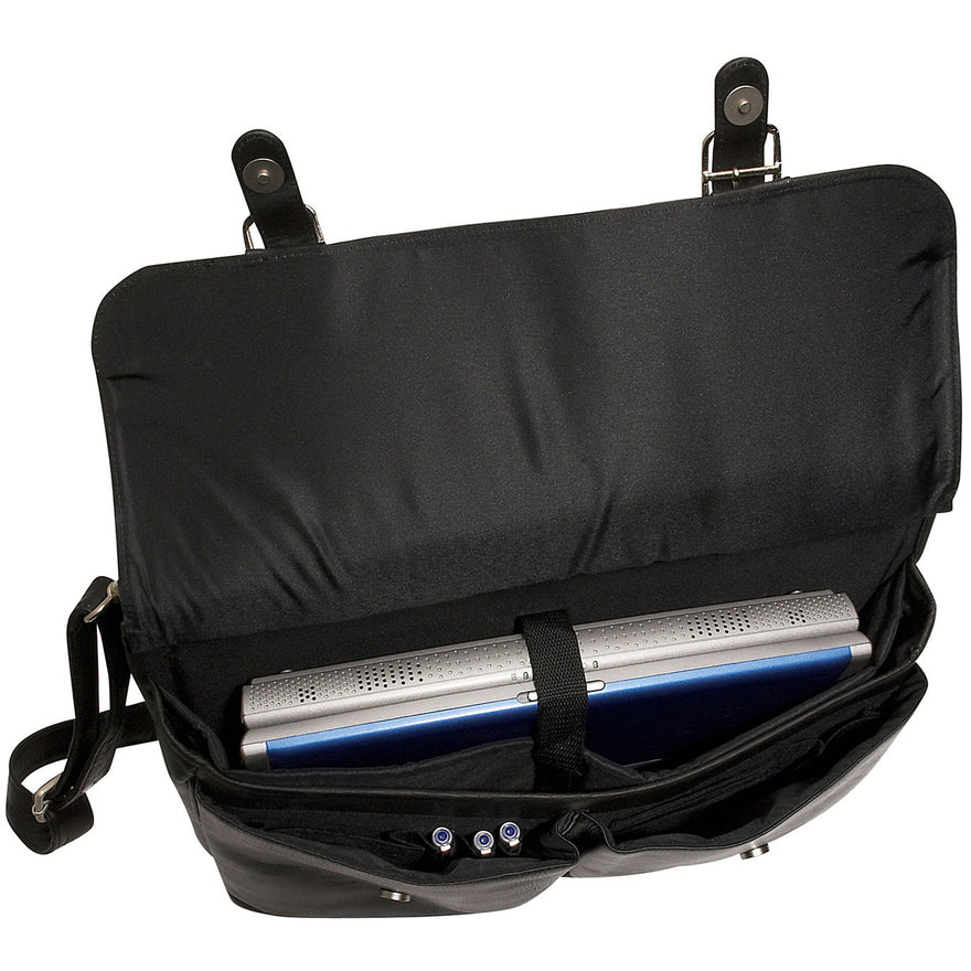 The David King Dowel Laptop Leather Briefcase has a large section under the front flap. It has a padded laptop section and two open pockets. It also features an organizer with pen slots, open pocket and card slots. Under the back flap section is an inside zip pocket and file separator. The front flap closes with slip locks, back flap closes with magnetic snaps. There is an adjustable removable shoulder strap with dog clips.