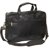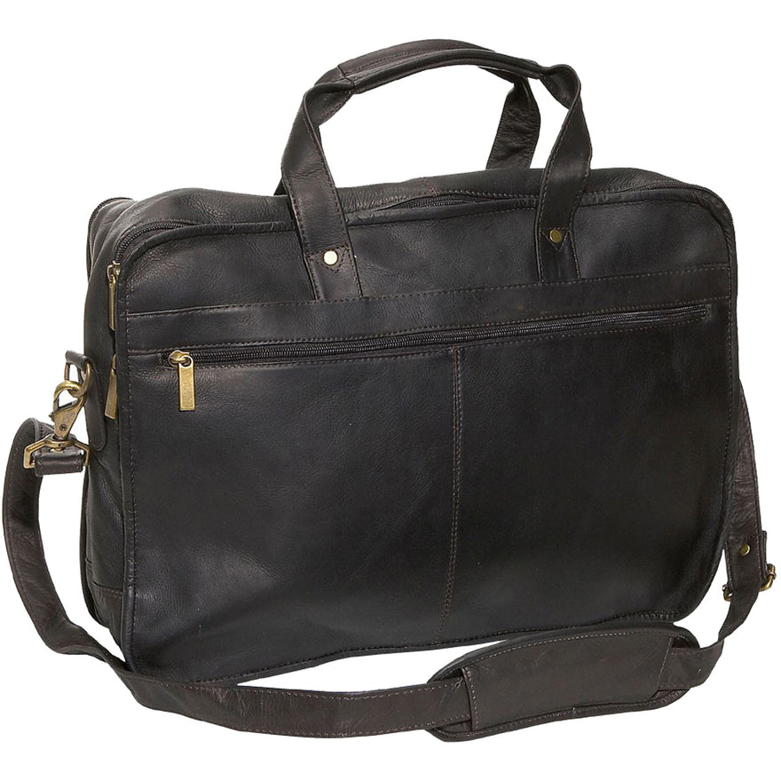 This David King Expandable Leather Laptop Briefcase has a front flap pocket closes with magnets and has organizer with card pockets, pen slots, and 2 open pockets. Zip pocket on front flap. Two top zip sections. Front section with five dividers. Back section with padded laptop section and 3 mesh pockets. Back zip pocket. Adjustable, removable shoulder strap.