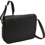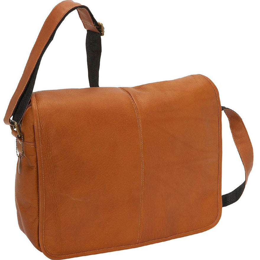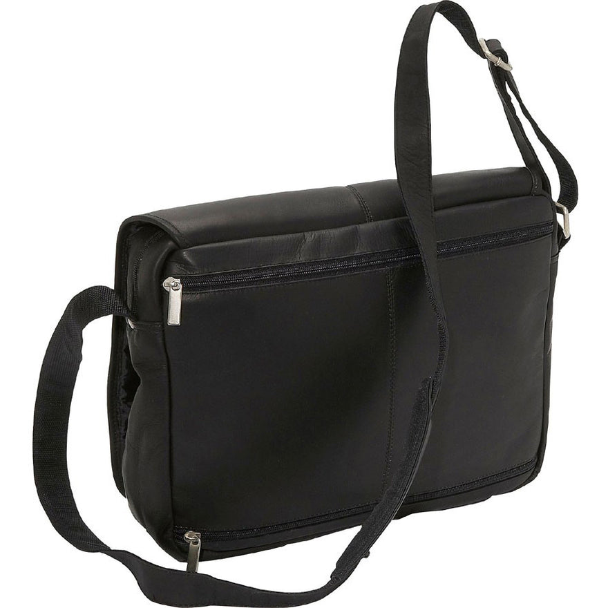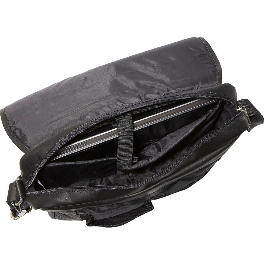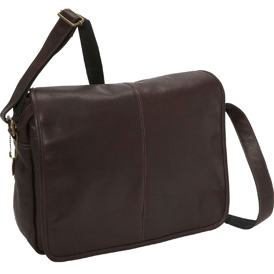 This David King Flapover Leather Laptop Flapover Messenger w/Back Trolley Pocket features magnetic snaps flap-over. Mesh pockets on the inside. Main compartment includes laptop pocket. 60" adjustable strap with shoulder pad. Also includes zippered back pocket.