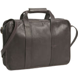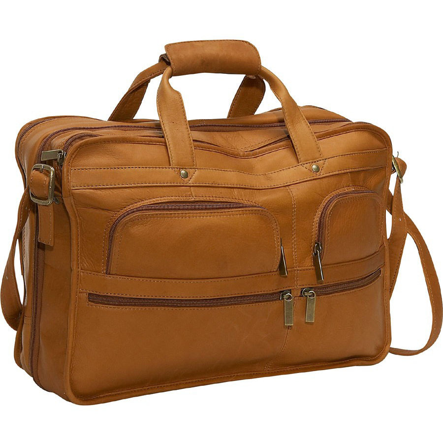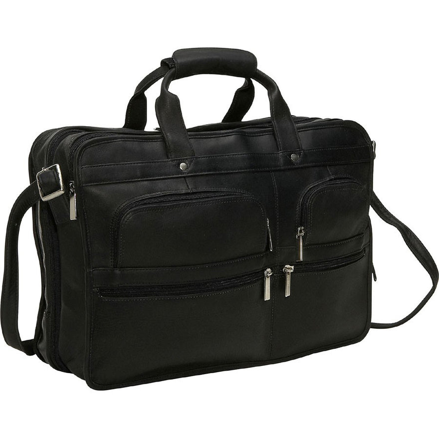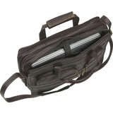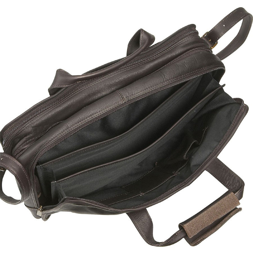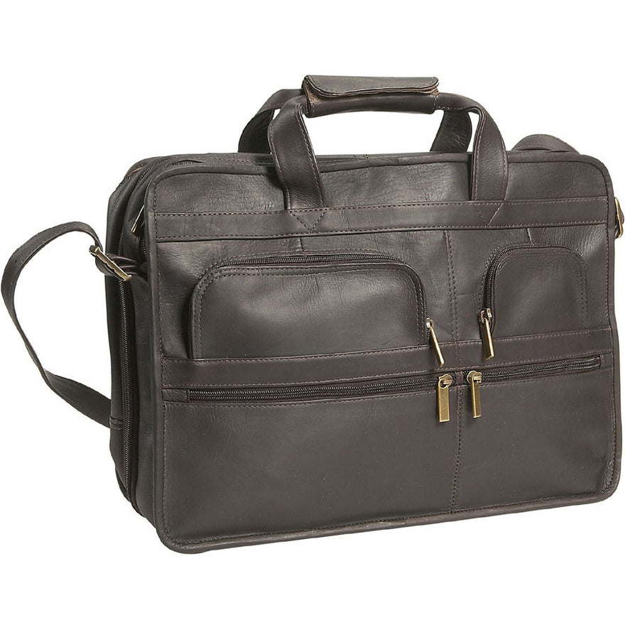 This David King Leather Multi-Pocket Expandable Laptop Bag features 2 "U"-shaped zippered front pockets. 2 smaller zippered front pockets. Top zip main compartment has a calculator pocket, card pocket and pen and pencil pockets. Top-zip back section has three dividers. Padded laptop section. Backside has leather loops to store newspaper or umbrella. Adjustable, removable shoulder strap. Leather wrap on handle for carrying comfort. Add your own padded notebook computer sleeve to make this bag work as a computer case.