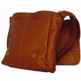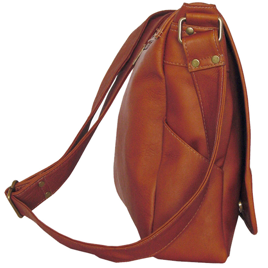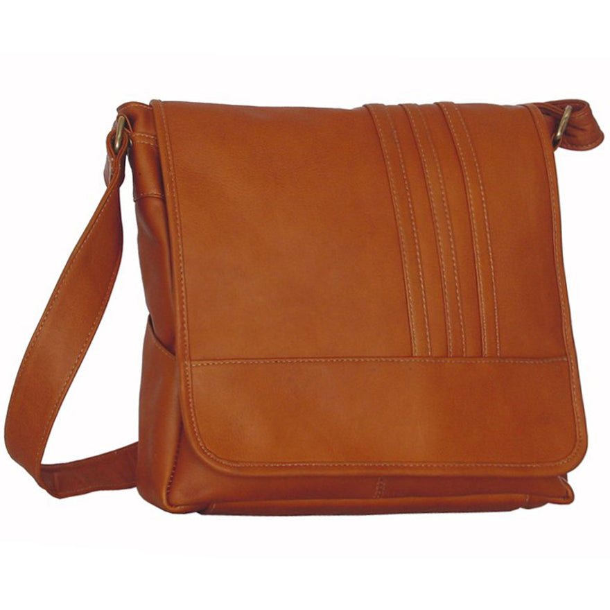 This David King Leather Vertical Laptop Messenger with triple stripes is a flapover messenger that closes nicely with 2 magnetic snaps. Decorative stripes on front give the messenger a distinct look. The exterior features a back zip pocket, an open side pocket, and an open pocket under the flap. The interior features a mesh pocket and pen slots for storage. The messenger comes with an adjustable shoulder strap.