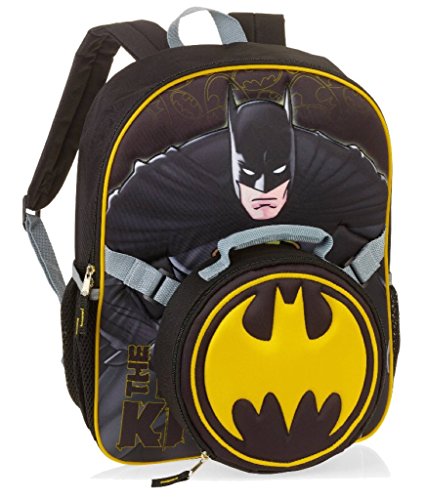 Details: DC Batman Dark Night 16" Backpack with Detachable Lunch Bag. Backpack Is corura with PE piping. Front panel is quilted.Detachable round lunch tote. Curved back straps. Side mesh pockets.