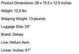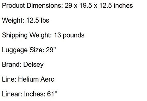 Details: The Helium Aero Collection from Delsey Paris is extremely lightweight and durable, designed for the frequent traveller. This 29 inch case expands up to 2 inches for maximum packing flexibility. The wheels and handles on this case are exceptional and provide the traveller with ease of use and a smooth ride. The four double spinner wheels keep ZERO weight on your arm and the dual locking handle system gives you the option to carry the bag different ways. The case also has a top and side carry handle for easy lifting into overhead bins or car trunks. Lastly, this case features an integrated recessed TSA approved lock which allows only TSA agents to inspect your bag without damaging your bag or lock. The Delsey Luggage Helium Aero collection is protected under a Worldwide Limited 10 Year Warranty.