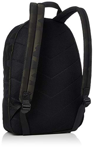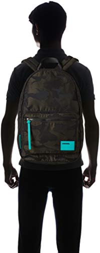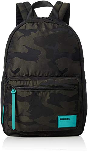 Details: This compact backpack is crafted from lightweight nylon with all over camouflage print. The simplistic design is given a fresh pop of color in the zipper pull and Diesel logo patch. It's equipped with a top handle, external and internal pockets, a padded section to hold your laptop or tech devices.