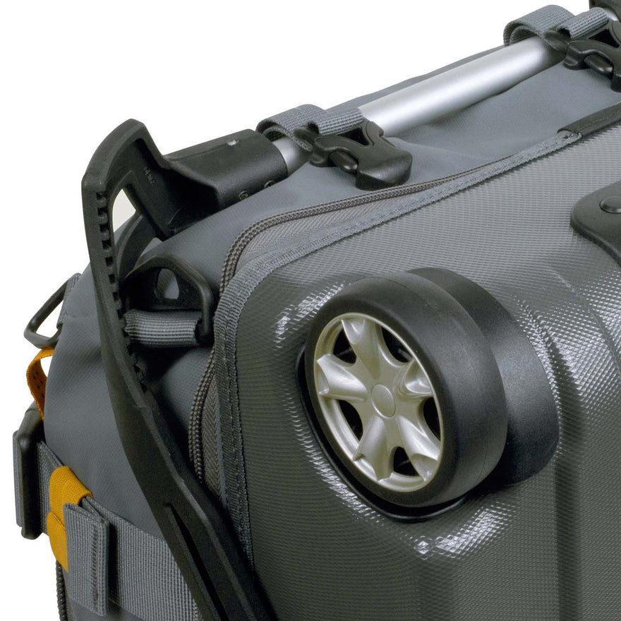 - Durable wheels, sturdy wheel housing, skid plate bumper protection, and recessed handle system