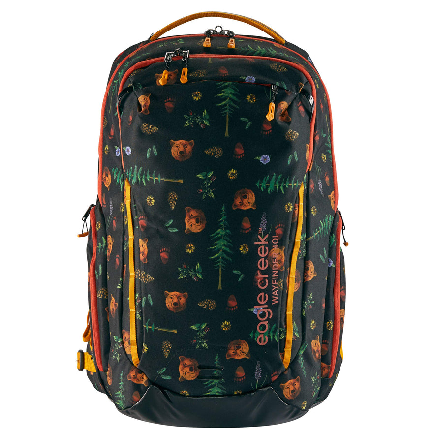 Details: Eagle Creek Wayfinder Backpack. Designed to be your favorite companion from day trips to adventures abroad, the Wayfinder 40L Backpack has a hidden tech pocket with cord organizers, sunglasses storage and more. The front pocket also has a drain duct so you can separate your wet jacket or clothes from the rest of your gear and let it drain out excess water when you run into rain.Gear loops, bike attachment points, sunglasses and water bottle pockets. 17" padded laptop compartment with water-resistant zipper. A front-zip compartment offers separated organized packing. Explore with 40 liters of storage and hands-free carrying. Recycled fabrics help minimize waste.