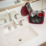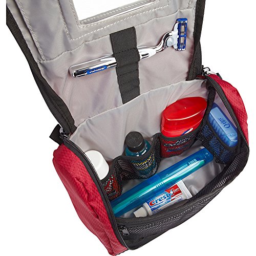 Details: Pack hair products, deodorant, toothpaste, and other overnight essentials inside this versatile toiletry kit from eBags. The eBags Portage Toiletry Kit - Medium is made from TechLite diamond nylon and features a well-constructed design with a flat bottom that allows it to sit upright on a countertop. The interior is fully lined and detailed with two inside zipper pockets, five elastic mesh pockets, a removable hanger hook, and elastic loops to hold brushes and razors. It includes an unbreakable framed mirror on the inside, while the outside features a single top handle for easy carrying. Choose from a variety of colors to suit your style or coordinate with your favorite luggage.