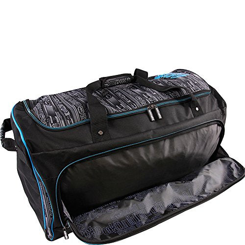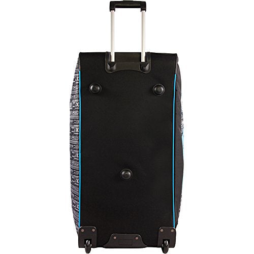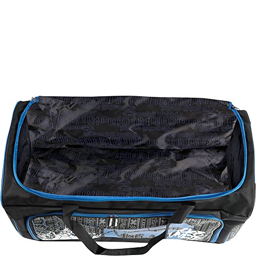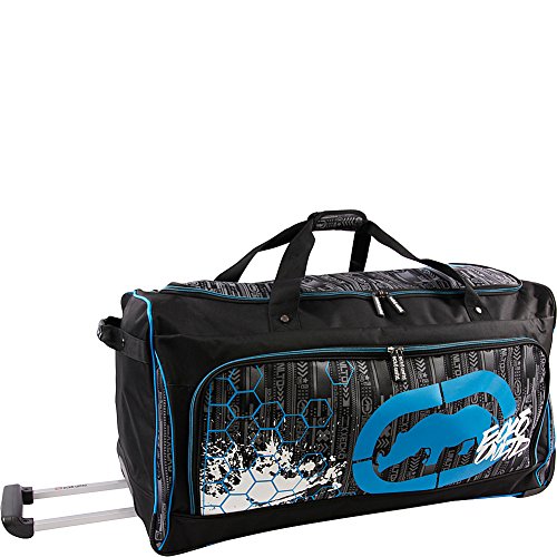Details: Easily spot your large Ecko Unltd rolling duffel bag at the airport carousel with a honeycomb print and paint spray design. With the amount of space this rolling duffel bag has, you'll have enough room to get away for an extended vacation. Additional space on the front with a 25" x 10" accessory pocket allows for ultimate packing capacity. With all the weight in this rolling duffel bag, handle straps have been reinforced with rivets at each stress point. Even with all this durability, comfort is provided with the extendable trolley handle that locks at two different height positions, allowing you to find the perfect height.