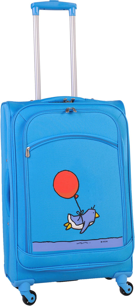 - Ed Heck luggage flaunts his unique pop art and features telescoping handle, spinner wheels and matching hardware colors