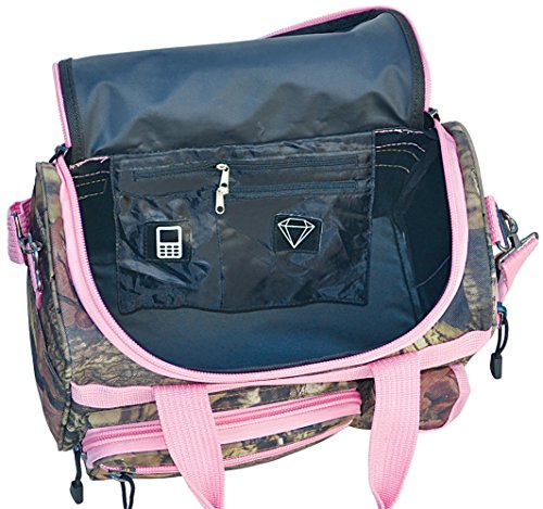 - Pink Mossy Oak 13″ ladies duffel bag has a D shaped main compartment opening for bigger items