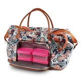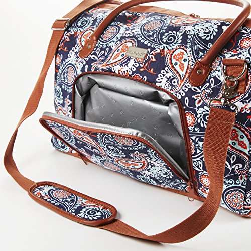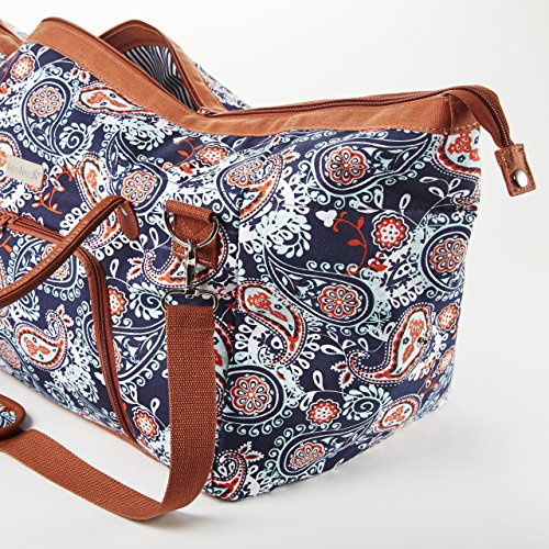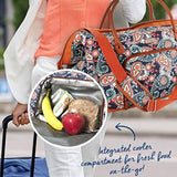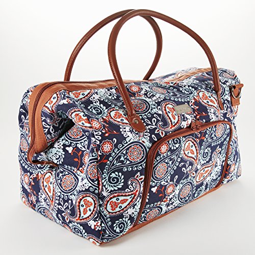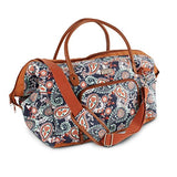 Details: Specially designed for an overnight stay or a weekend trip. The Weekender makes your traveling easy with its roomy and spacious design. It also includes an integrated zipped cooler for convenient, healthy meals on-the-go. Cooler compartment features grey PEVA lining that is easy to wipe clean. The main compartment is roomy enough to fit a laptop, books, clothing & more! Main interior is lined with navy & white stripes for an added touch of style and visibility. This all-in-one duffel bag is large enough for all your major essentials! Fashion-forward pattern, faux leather handles, and a chrome front detail make traveling in style easy! Duffel bag measures 18" wide x 11" deep x 14" tall.