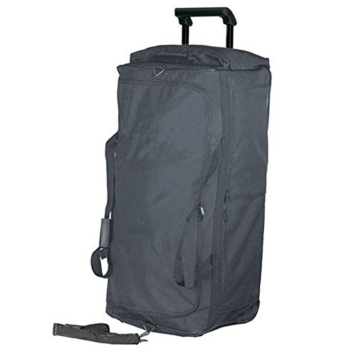 Details: Made of 600d polyester, a great piece for sales samples, 2 zippered front pockets, additional zippered pocket on one end of the duffel, features a sturdy pull handle and dual wheels on the bottom, 2-3 heavy-duty bottom rails help support heavy loads.
