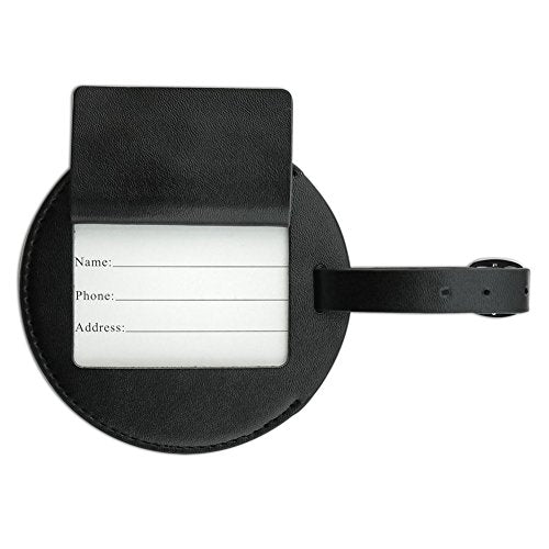 Details: This is an awesome leather luggage tag that will set your luggage apart in style. The tag is made of black leather and the design shown is printed on one side with special inks. A card for your address information (included) slips inside and is protected by a clear vinyl window. The tag is approximately 4.0" (10.2cm) in diameter. The leather strap shown is also included. Sold individually.