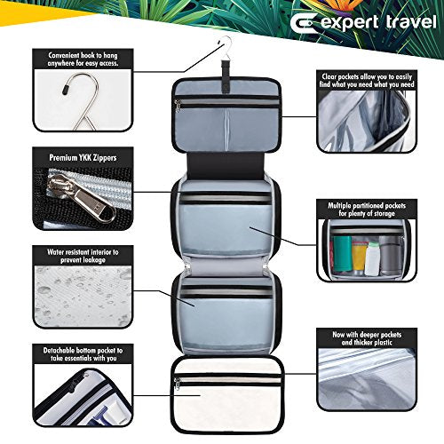 Details: When we designed this product, we wanted to bring you more than just a hanging toiletry bag. While the Expert Travel does an amazing job at that, it also functions as a travel makeup bag, cosmetic bag, bathroom and shower organizer, hygiene bag, and much more. The multiple compartments allow you to easily organize all of your toiletries, make up/cosmetics, and bathroom products. Plus, the bottom pocket is detachable in case you just want to bring a few essentials with you when traveling instead of the whole bag. We also wanted a toiletry bag for men and women, so we went with a unisex design as well as a multitude of colors to choose from. IMPORTANT UPDATE: As of July 1st, 2018, we completely redesigned our toiletry bag to bring our customers exactly what you asked for. ALL REVIEWS LEFT PRIOR TO JULY 1ST 2018 ARE BASED ON THE OLD DESIGN. Updates we made: We added YKK zippers (the best zippers on the market), thicker plastic for the pockets (to enhance the durability and leak-proof aspect), and also expanded the pockets/bag overall to hold more items. There's no doubt in our mind that we now have the best hanging toiletry bag on Amazon. We even stand behind it with a lifetime warranty; that's how confident we are!
