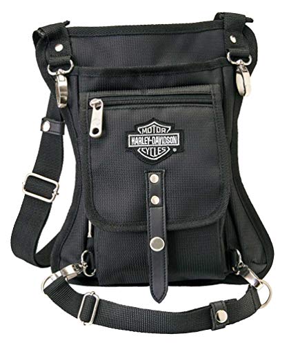 Details: Harley-Davidson Unisex "Side Slinger" 2-in-1 Bag, 98223. 2-IN-1 can be worn on your leg like a holster or over your shoulder as a sling bag. Versatile straps can be worn over leg, waist or shoulder. Numerous secured interior compartments. Made from light-weight, water-resistant box weave polyester. Size: 12" x 10".
