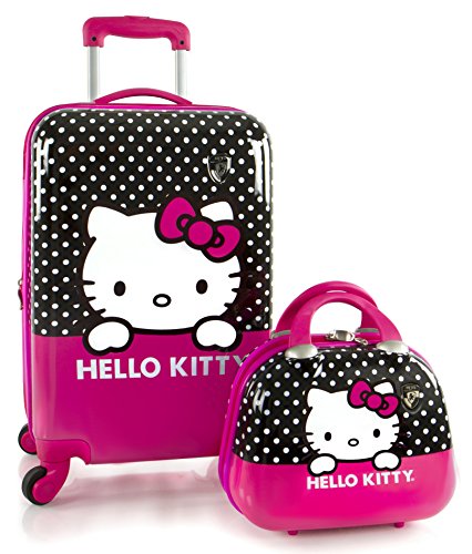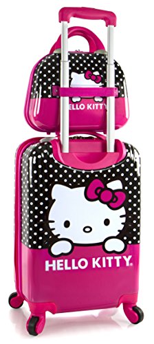Details: The Hello Kitty hard-sided luggage 2 pc. set includes a 21' expandable luggage piece and a hard shell beauty case. Both luggage and beauty case features a lovely print of Hello Kitty on the front and back surfaces. The 21' luggage allows for more packing space due to its zipper release expansion system, while still remaining lightweight. Its four spinner wheels spread the weight evenly allowing for smooth and effortless mobility on different terrains. The beauty case has an elastic strap built on the back that allows for easy attachment to the luggage, the interior comes with a built-in mirror and divider.