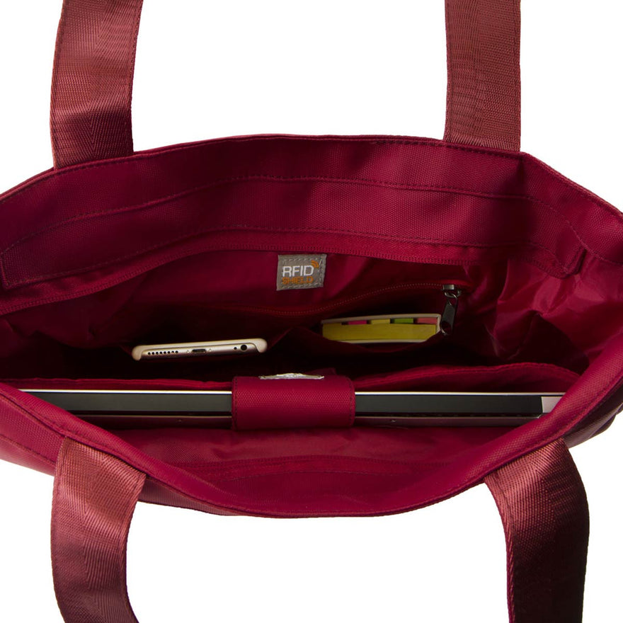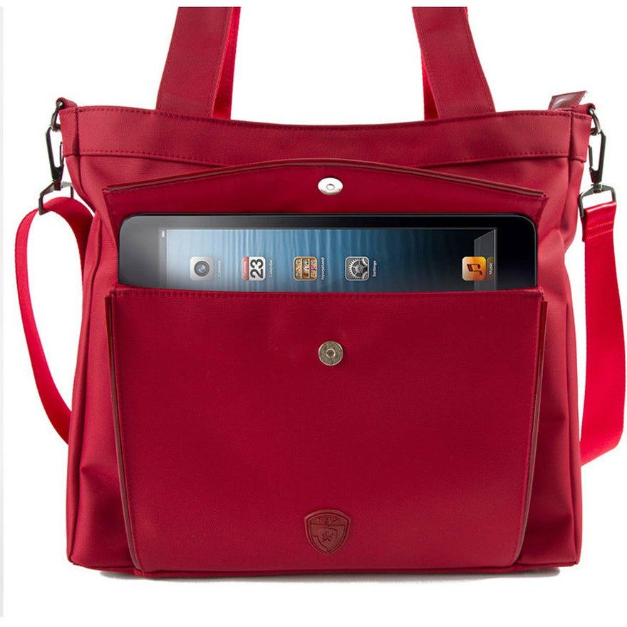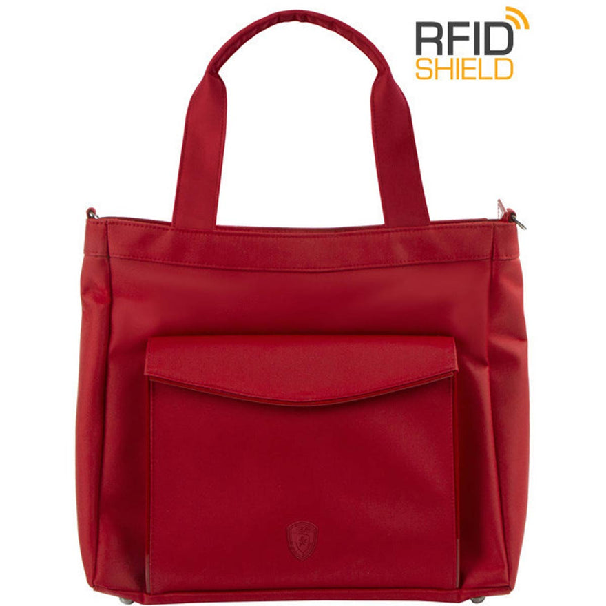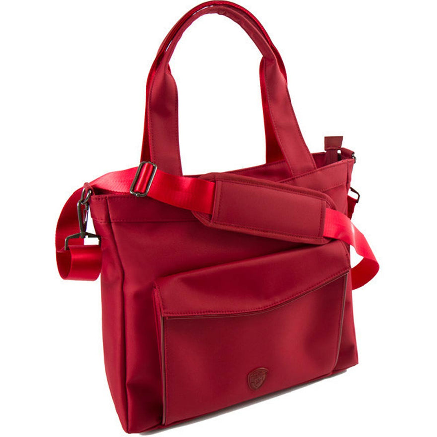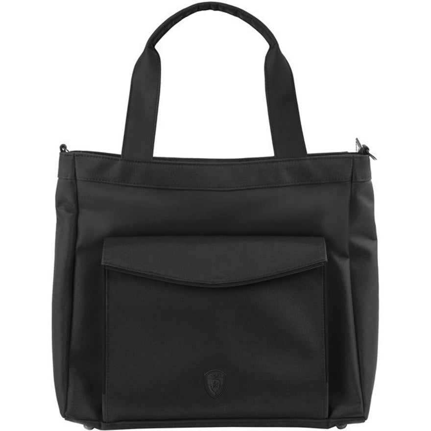 Part of the HEYS HiLite Travel Bags Collection, the Laptop Tablet Tote is a lightweight, fashionable and tech-savvy bag for todayrsquo;s business traveler on the go. The front exterior pocket is fleece-lined and can carry a 10rdquo; tablet, and has a secure magnetic closure. Features HeysProtecttrade; RFID-shield technology, to keep you safe from wireless theft. The interior includes a padded, fleece-lined compartment for a 13rdquo; laptop, multiple slip media pockets and a secure zip pocket. Whether carrying it as a shoulder bag or crossbody using the detachable/adjustable padded shoulder strap, or by hand using its double tubular handles, it offers plenty of capacity and multiple compartments for business supplies, files, media, documents and other essentials. When travelling, the back zip pocket converts into a slide-through panel for trolley handles. Its sturdy base with quality metal feet ensures that its always stable. Features elegant, color-matched patent accents and gunmetal hardware.