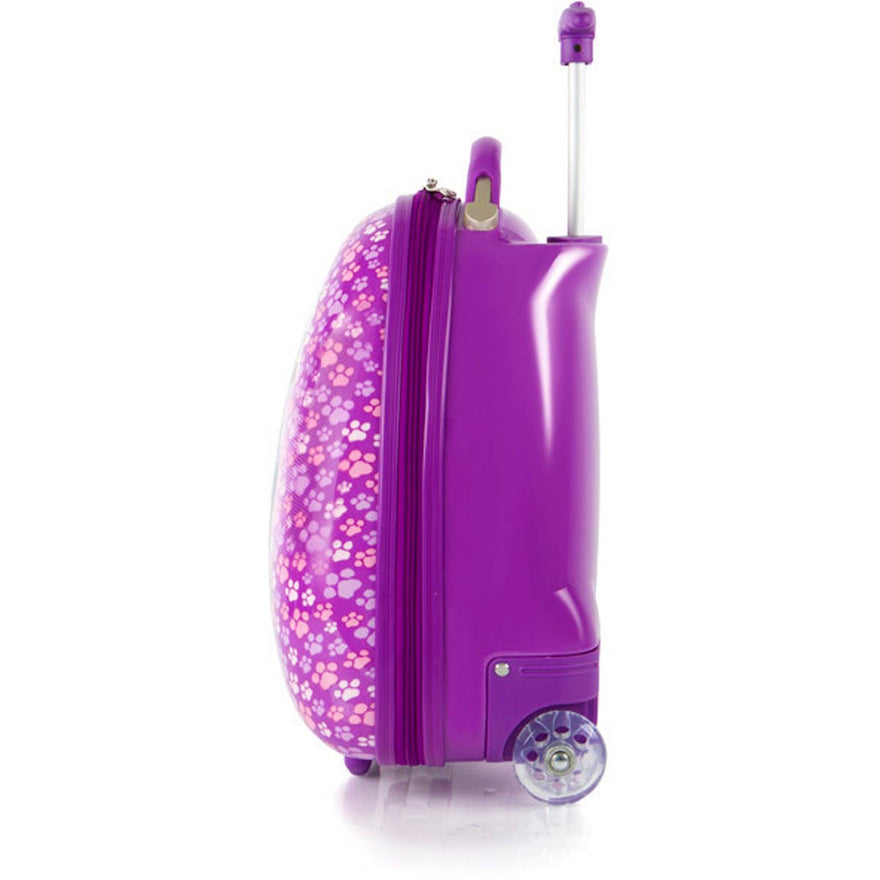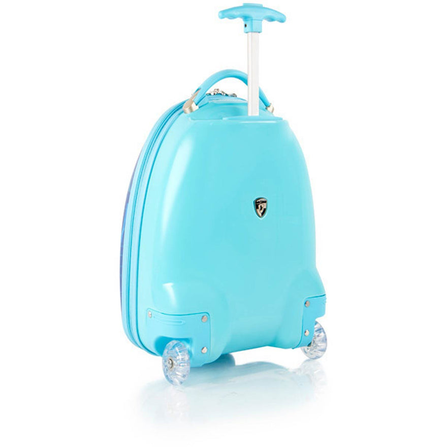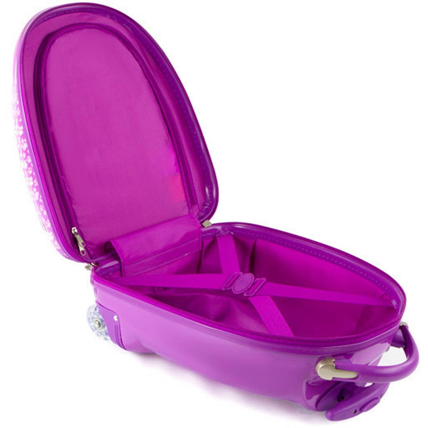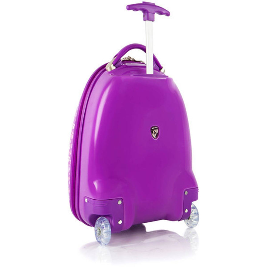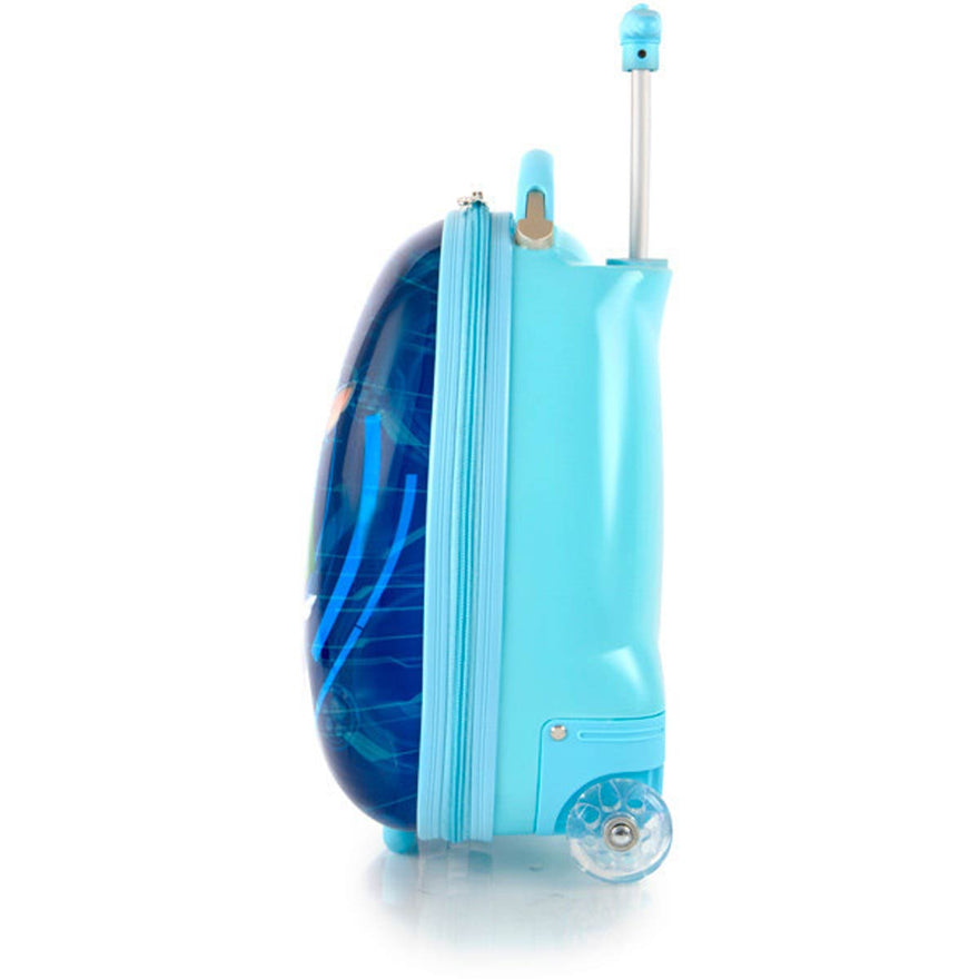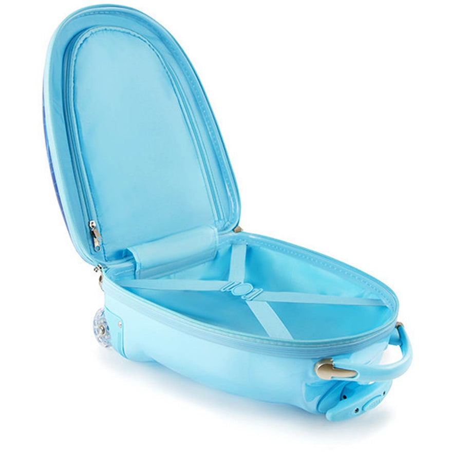 In creating a 'High-end' series for Nickelodeon, our designers incorporated several children-specific features. One of these is the internal 'reversed-curved' handle system that curves the handle inwards amp; upwards closer to the child, making it much more comfortable for the child - at a low height - to hold and navigate the case. The Patent Pending design of this case also allows the wheels to 'protrude' out. This protrusion keeps the case elevated, so that even when being rolled at a very low height off the floor, the wheels will be the only point of contact and the case will continue to roll with ease. The cases weigh in at a mere 3.7 lbs, and feature our inline skate wheels that make their rolling even smoother, so any child can easily wheel these fun cases around. They also have a zipper closure system, that when opened reveals a beautifully lined interior as well as a zippered divider for internal organization.