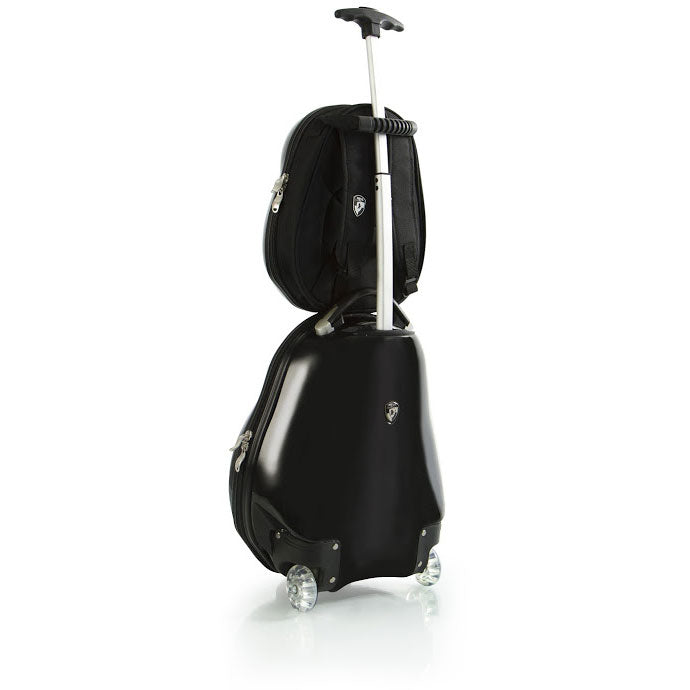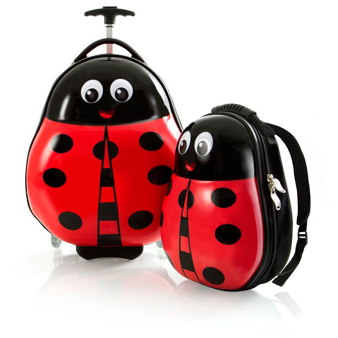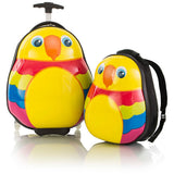 The Travel Tots 2pc. Kids Luggage amp; Backpack Set is the perfect travel companion for your little ones. The Travel Tots collection was created by Heys with the unique characteristics of children in mind, incorporating several design features that benefit children. Available in 4 different animal prints (Parrot, Bee, Ladybug and Penguin) each piece has been printed with colourful and vibrant artwork adding loads of fun to travelling for the kids and the entire family. The luggage print is protected by a layer of clear coat which also gives it a beautiful glossy shine. The patent-pending design of this case also allows the wheels to protrude out keeping the case elevated preventing the bottom of the luggage from touching the ground. With the luggage only weighing in at a mere 3.5 lbs., children can wheel these fun cases around, as they also feature our inline skate wheels that make rolling even smoother. Both the luggage and backpack piece have a zipper closure system, when opened reveals a beautifully lined interior. The Travel Tots luggage is carry-on approved.