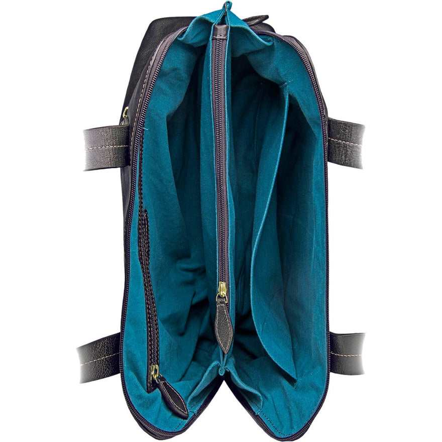 - Double leather handle strap with a 10"" drop length.