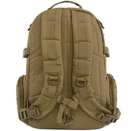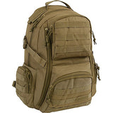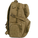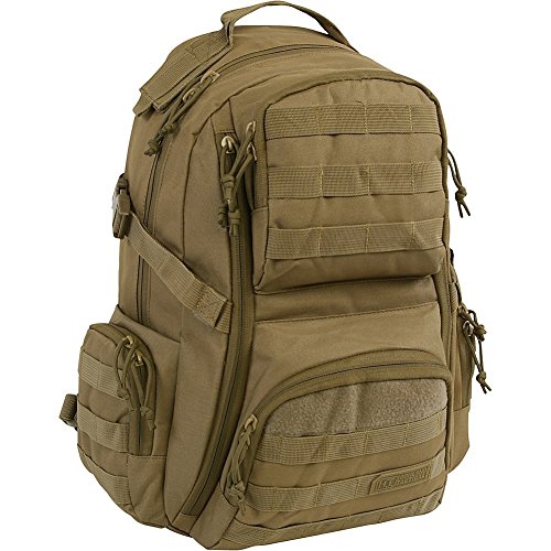 Details: This backpack is constructed of heavy weight durable polyester. It features one large main compartment with laptop sleeve and large zippered mesh pocket, a small front accessory pocket with organizer panel and two additional side pockets to hold extra gear or water bottle. Includes padded air mesh adjustable shoulder straps with quick release clips, 2 D-rings and MOLLE webbing to add additional gear. Right and left side hook and loop hydration tube access with straps to hold water bottle in place. A Padded back panel, adjustable sternum slider for comfort and support. Hook and loop patch holders, 2 slide compression straps, MOLLE webbing on front to add pouches and gear, and bottom bed roll webbing. Dimensions: 18.2" (H) x 15.5" (W) x 11.5" (D). Capacity: 53L.