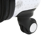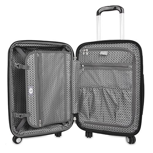 Details: J World New York art polycarbonate carry-on luggage features a telescoping double handle, TSA approved combination lock, elastic cross straps and interior divider panel with mesh pockets, double spinner wheels, and top and side grip handles