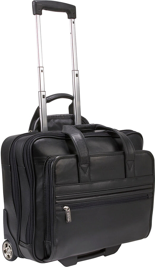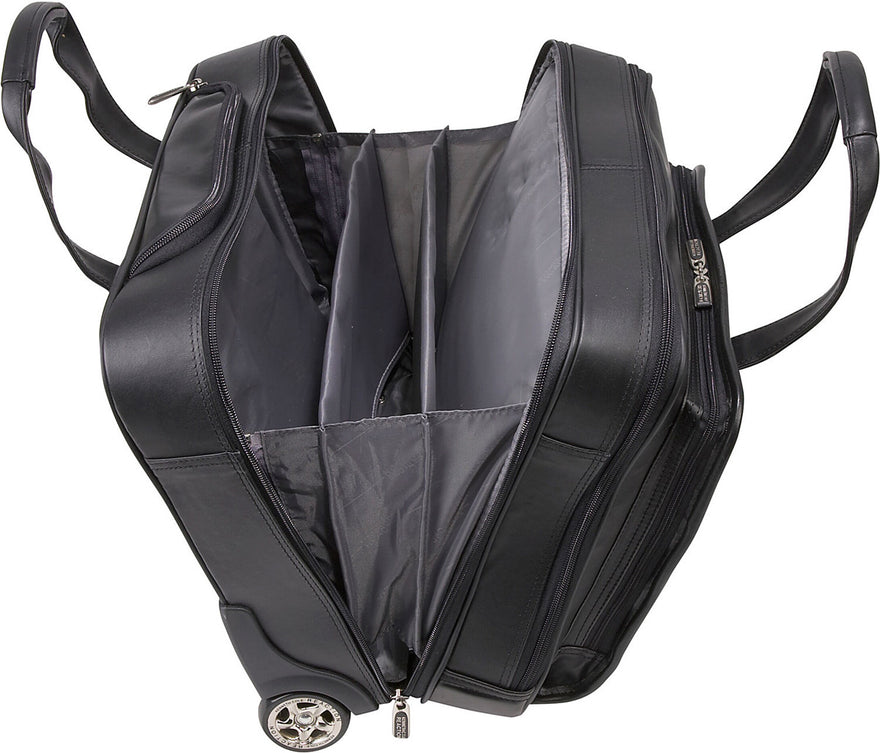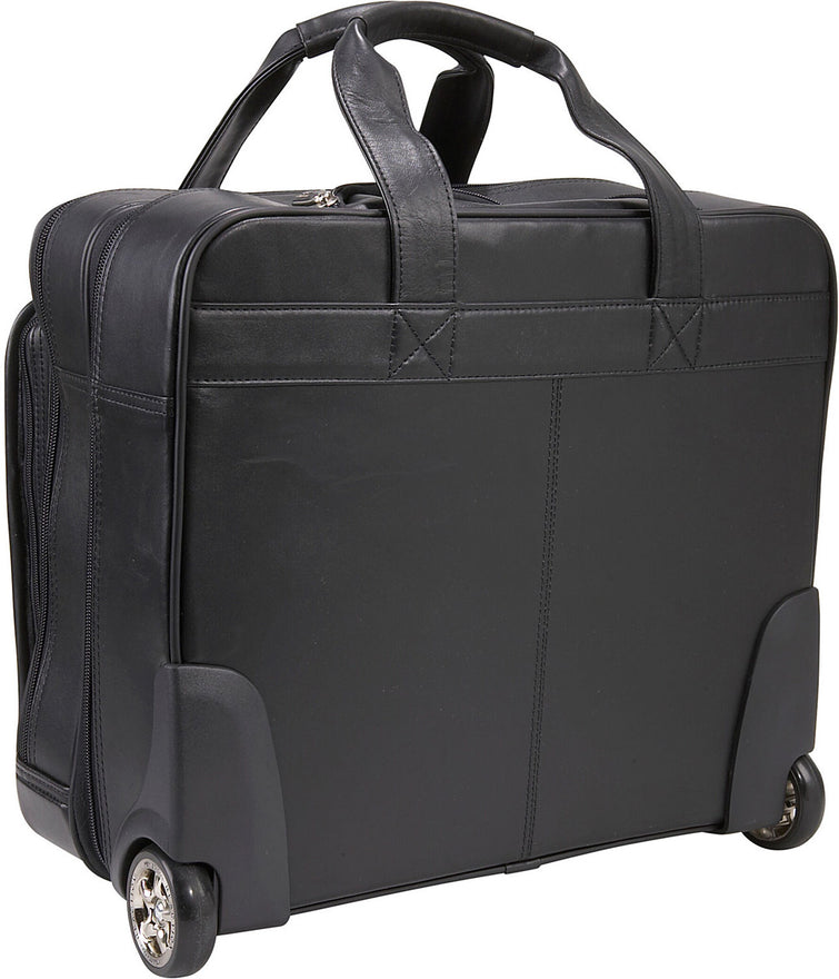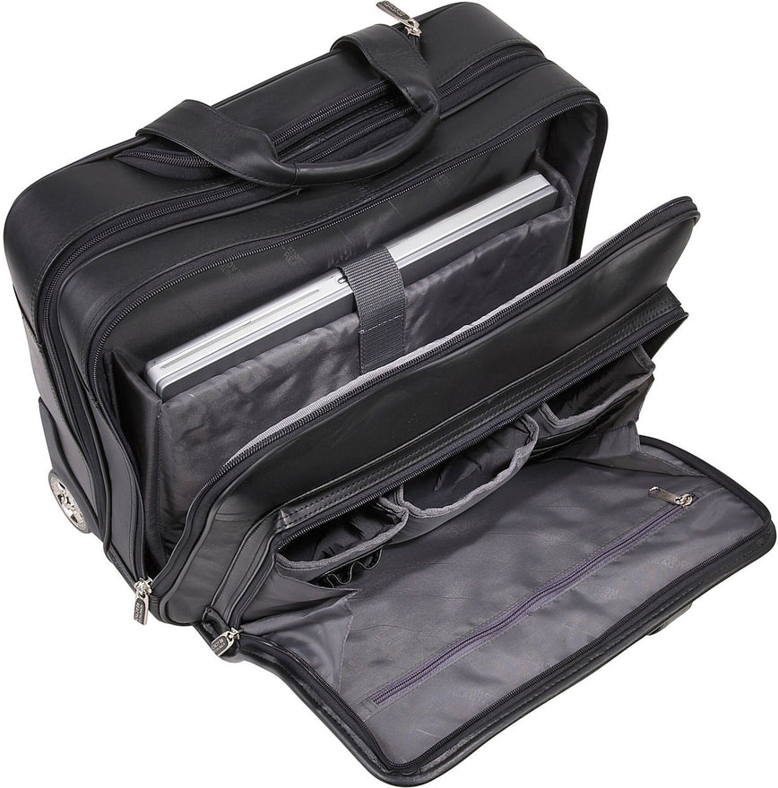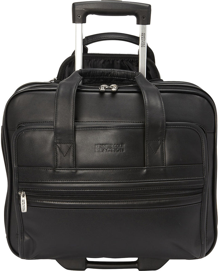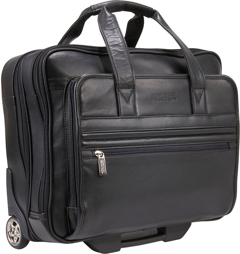 Make the daily commute a little bit easier with your laptop and other essentials stored inside this rolling laptop case from Kenneth Cole Reaction. The Kenneth Cole Reaction "Keep On Rollin" Double Gusset Wheeled Portfolio/Computer Case is made from top grain Napa leather and features a multi-compartment design with a retractable locking handle system, smooth rolling in-line skate wheels, and top handles for easy lifting. This business case includes a padded laptop pocket, a file divider to hold important folders and documents, and an organizer compartment with slip pockets and storage areas for all of your small items and personal accessories.
