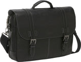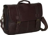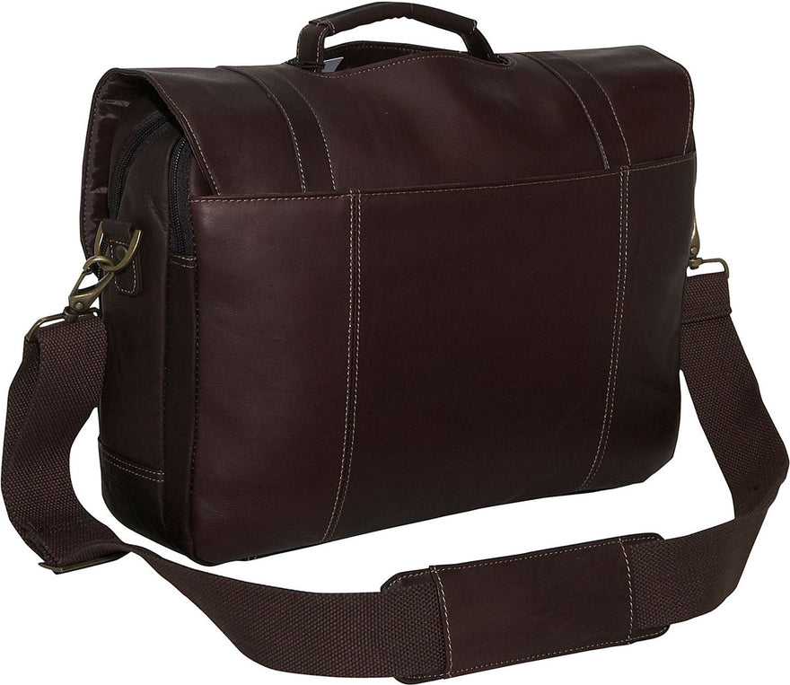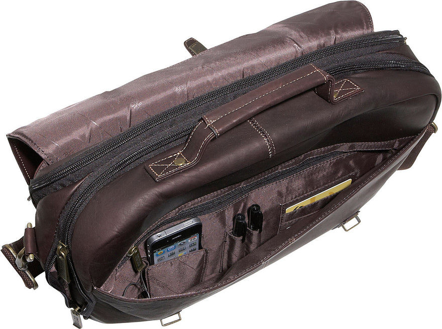 Keep your laptop computer and everyday business essentials neatly together in the Kenneth Cole Reaction Show Business Columbian Leather Flapover Computer Case. This sturdy, classically designed Columbian leather case features a porthole design and fully lined, double gusset construction with a secure flapover closure. Its front compartment boasts a padded laptop computer pocket with three open padded pockets for managing accessories, and an open rear compartment is perfect for files, folders, documents, and brochures. A front pocket organizer contains pen loops, credit card slots, and a cell phone pocket, and it has a padded shoulder strap and a top carry handle.