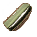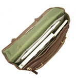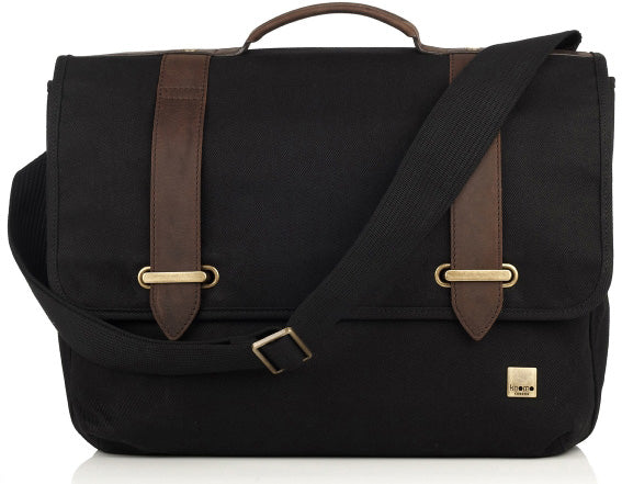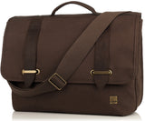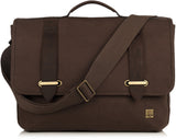 Internal padded compartment to hold a laptop up to 15". Separate compartment for storing a tablet/iPad. Fastens with magnetic flap closure amp; double vintage-look belt closure. Leather handle and detachable nylon-weave shoulder strap.