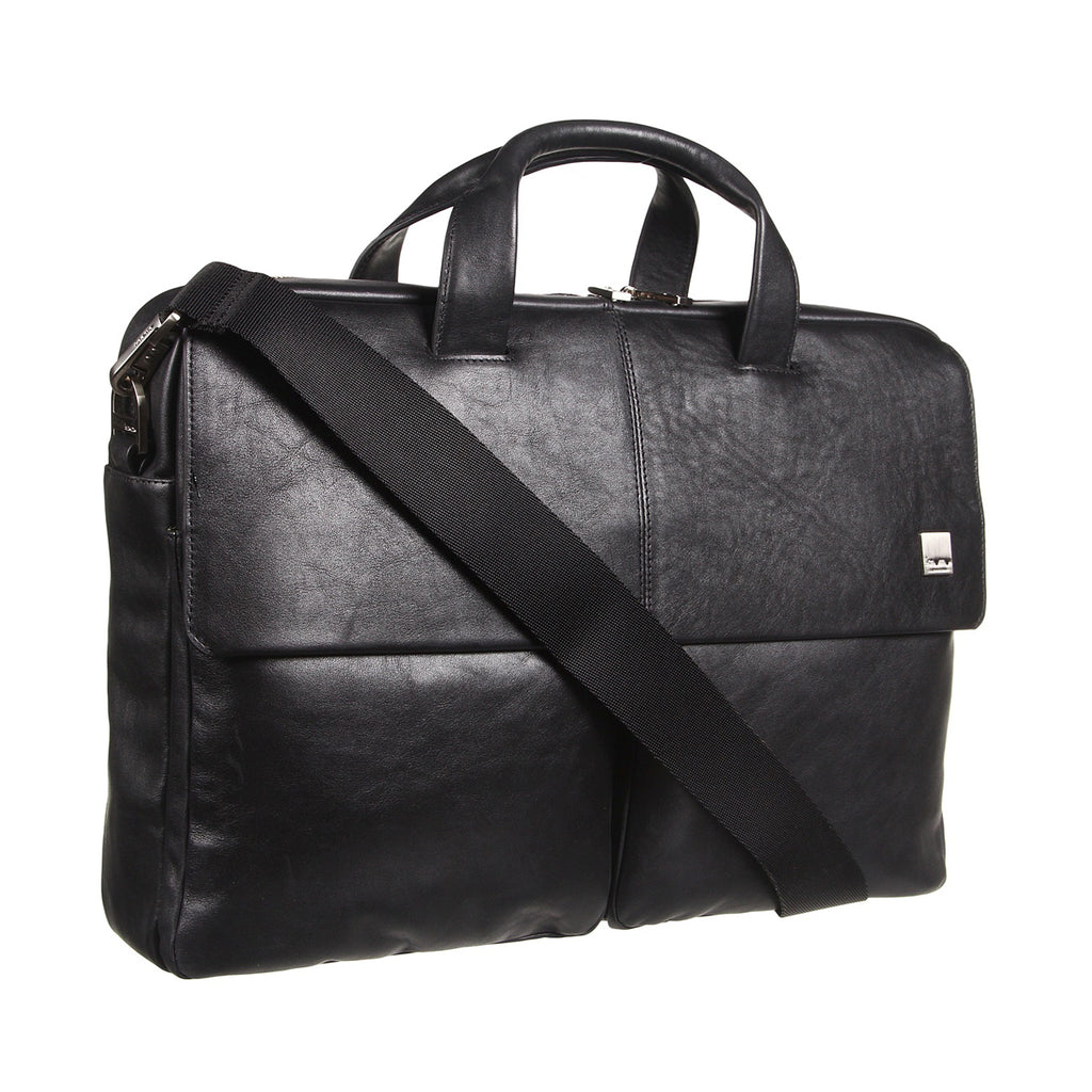 Dundee is a sleek menacirc;s work briefcase, made from luxuriously smooth full-grain leather, with a clean, modern briefcase design. The bag holds a 17" laptop and all your work essentials and the detachable strap offers ease-of-use. Holds up to a 17" laptop within quilted laptop pouch with shockproof protection -Carry 2 ways: via short carry handles or detachable, adjustable shoulder strap -Fastens with top-zip for security -Magnetic tabs fasten front flap, under flap lies open pouch on left amp; zipped compartment on right -Folders or files fit inside, holds A4 pad