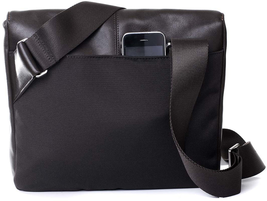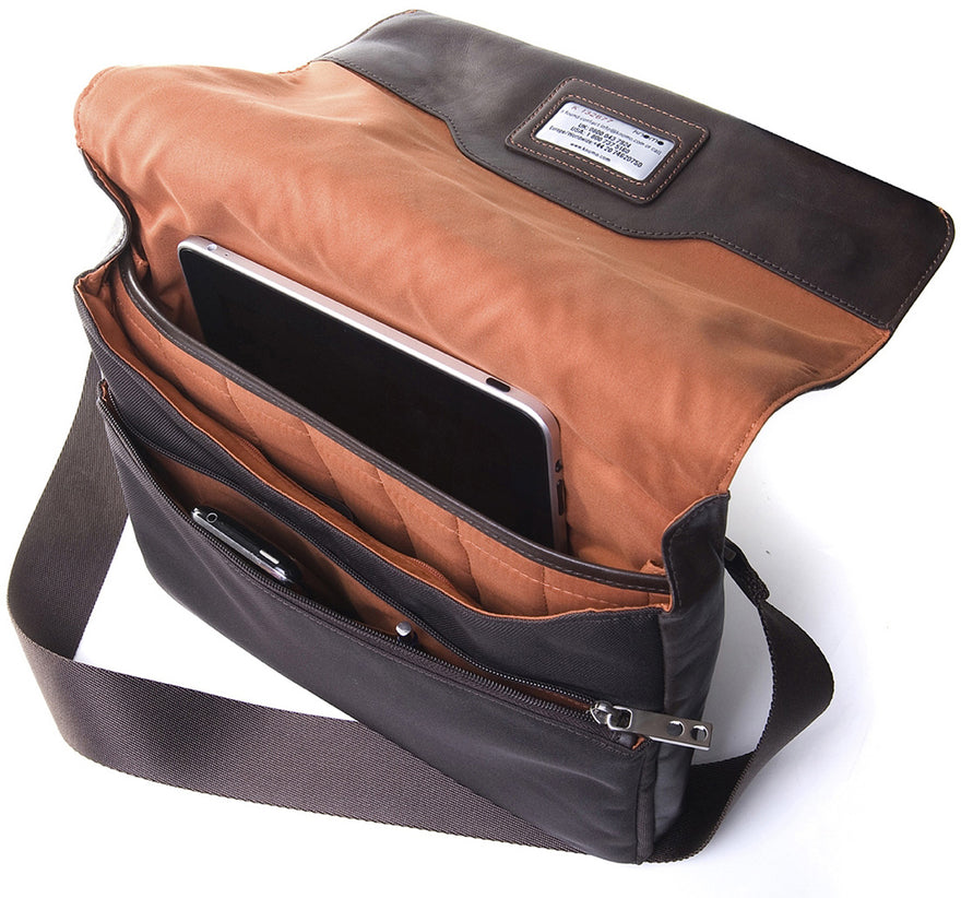Padded laptop compartment holds a laptop up to 11". Front pocket for a tablet and/or smartphone. Magnetic snap-poppers secure the front flap. Extendable durable nylon weave shoulder strap.