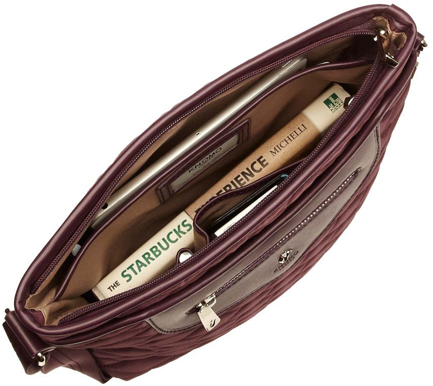 - Knomo signature external front zipper pocket for keeping your smartphone or keys handy