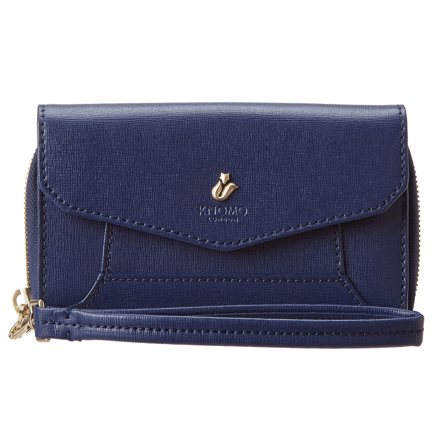 The Seymour smartphone wristlet from Knomo is a versatile mix of a purse and mini clutch. This wallet is made with a Saffiano textured leather. Special open compartment fits most smartphones giving you a place to store it. Handy wristlet strap allows you to carry this wristlet on its own. Zip compartment allows for separation of coins, bills and credit cards