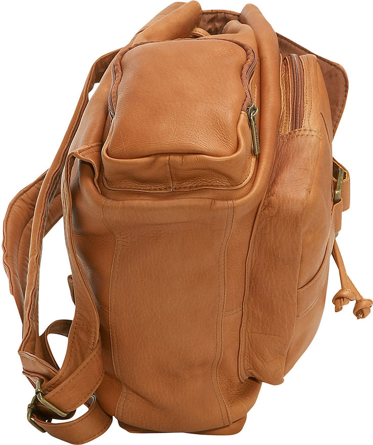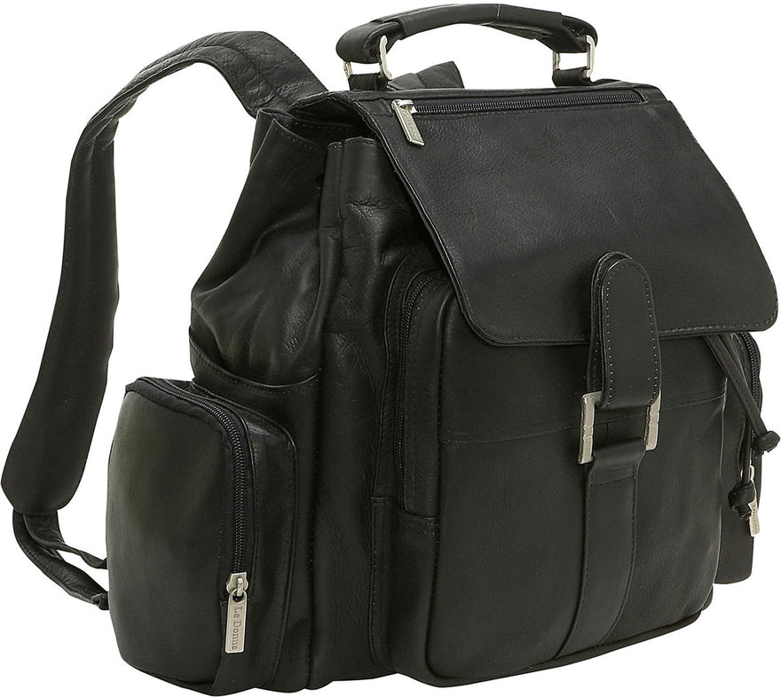 This Le Donne leather backpack has classic styling in a contemporary design with all the pockets you need for all your essentials. This soft, supple, and luxurious full-grain Vacquetta cowhide leather backpack features a compact design and custom, antique hardware; and it's available in several colors. It boasts a spacious, lined interior with a magnetic loop closure and drawstring detail, a zippered compartment, and plenty of room for your books, binders and folders, or for your laptop computer and files. A front u-zip compartment contains pen loops, card slots, and slide pockets; and side zippered pockets provide additional storage space. The Le Donne Leather Multi Pocket Back Pack comes with padded, adjustable shoulder straps for your carrying comfort.