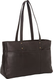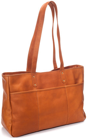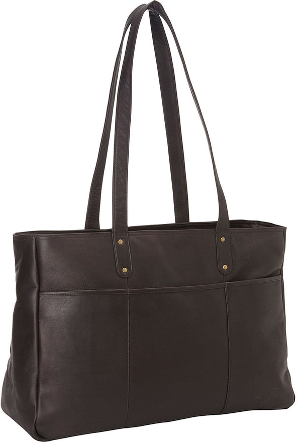 Add a touch of sophistication to any outfit with this chic leather tote bag from Le Donne Leather. The Le Donne Leather Traveler Tote bag is crafted from genuine Colombian full grain leather and features a sleek and elegant design with a classic look that never goes out of style. This tote bag has a large main compartment with a recessed top zipper closure and a fully lined interior that includes a large zipper pocket to hold valuables. Three exterior slip pockets offer added storage for often used items while two riveted shoulder straps make it easy and comfortable to carry.