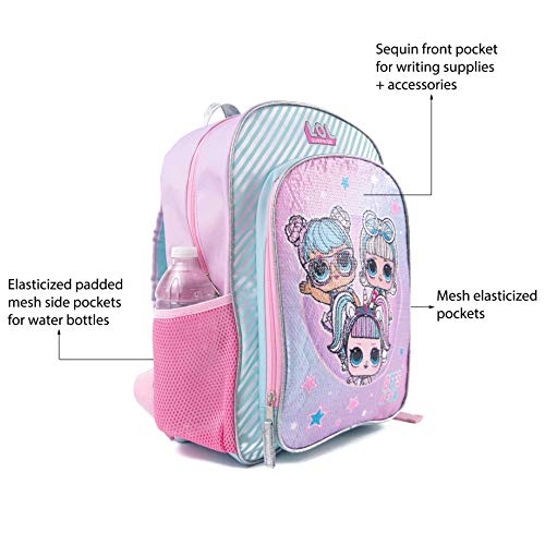 - SEQUIN LOL SURPRISE DOLLS ON FRONT POCKET - She'll love the sequined, glittery dolls in pink and blue, including the popular LOL unicorn surprise doll. Make going to school more fun with the familiar comfort of her favorite characters!